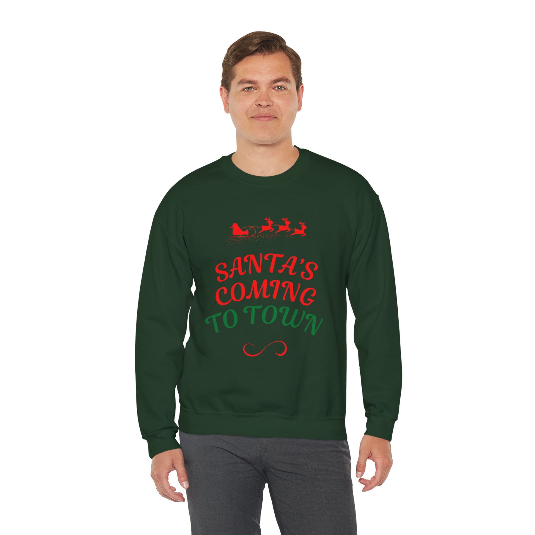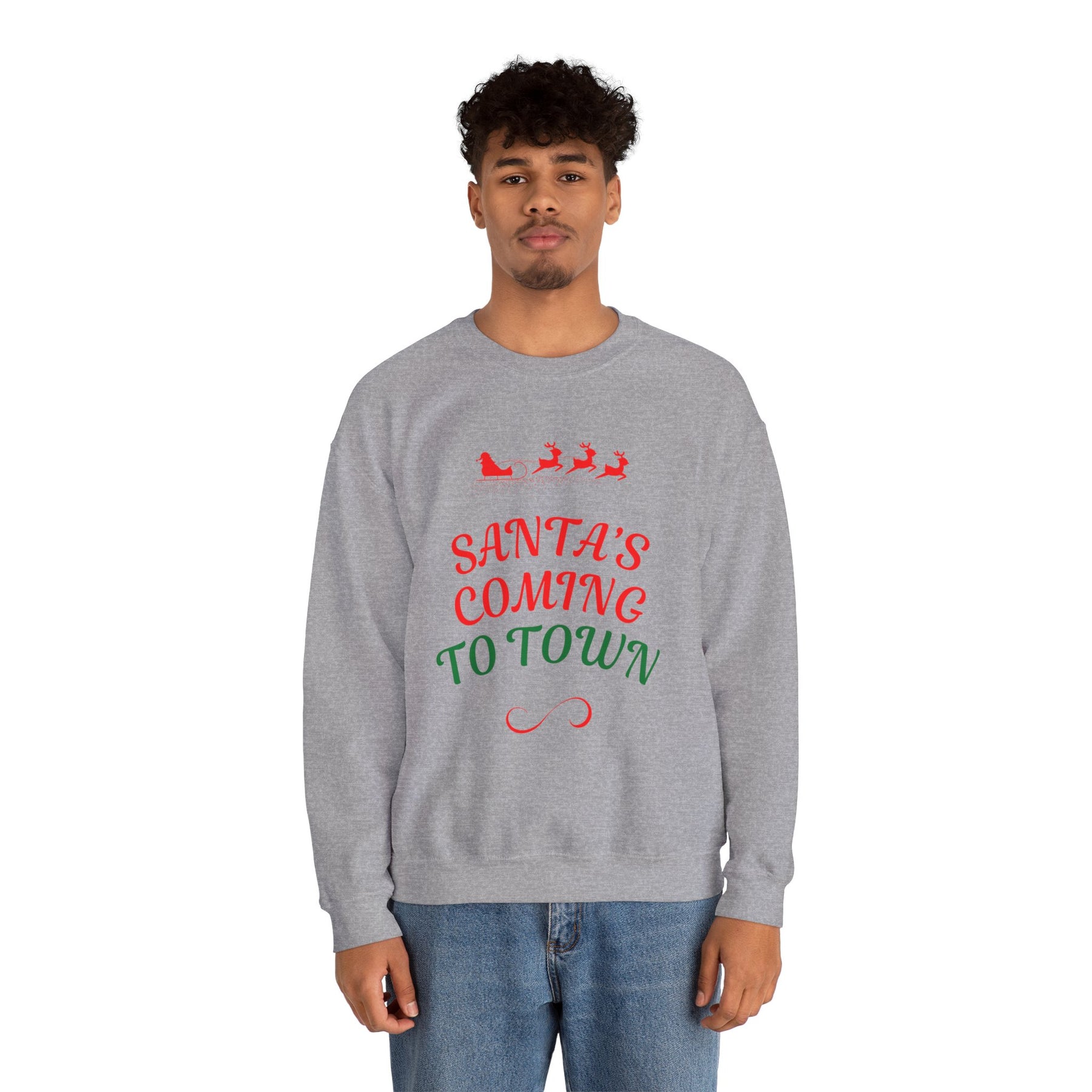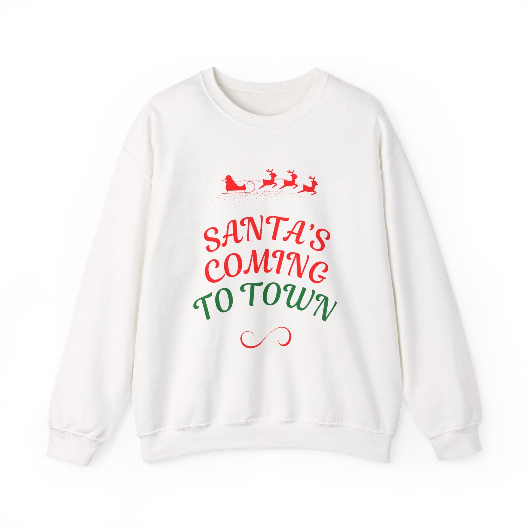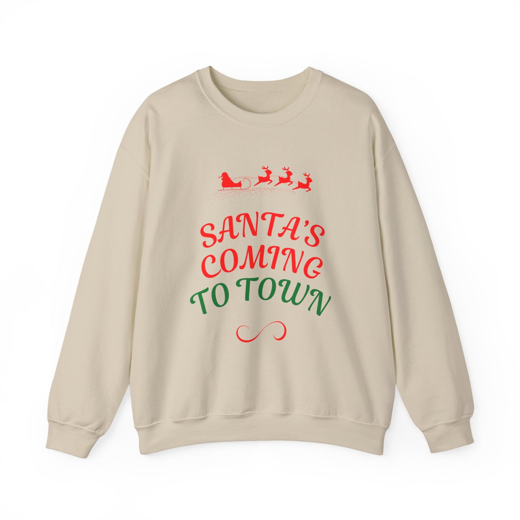 Soft, cozy, and quietly festive — this crewneck brings a warm nod to holiday nights. A simple sleigh-and-reindeer silhouette floats above playful lettering: “SANTA’S COMING TO TOWN” in red and green hues. The midweight 50/50 cotton-poly blend feels lived-in from the first wear, with a classic crew neckline and clean lines that tuck easily under a coat or stand alone on a chilly evening. Thoughtful details — tear-away neck label, reinforced double-needle stitching, and OEKO-TEX certified dyes — make it comfortable and last past one season. The design sits centered on the chest for an uncomplicated, merry look that works for tree-trimming, cookie baking, neighborhood light tours, or quiet nights by the fire.