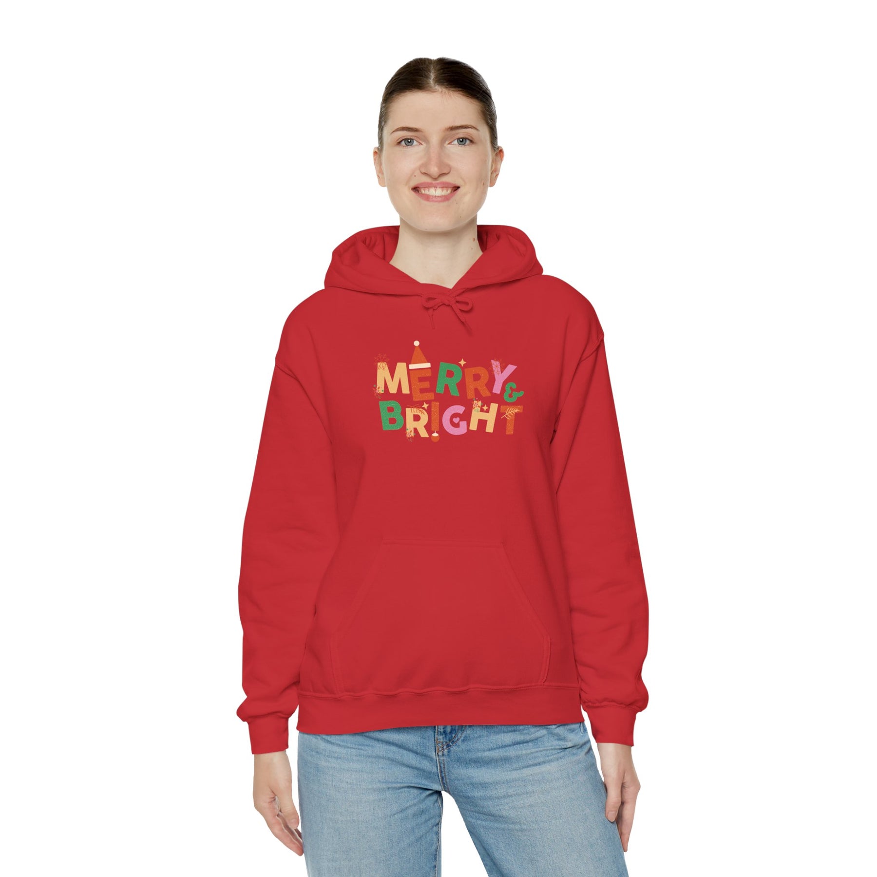 Soft, cozy, and cheerfully festive — this hooded sweatshirt brings a playful holiday spirit to everyday wear. The bright, hand-lettered "MERRY & BRIGHT" design pops against the clean white fabric, adding a colorful, whimsical touch to quiet mornings with cocoa, tree-trimming afternoons, or relaxed holiday gatherings. The roomy kangaroo pocket and double-lined hood make it easy to layer over tees or flannels when the temperature drops. Lightweight enough for indoor comfort, yet warm enough for brisk winter walks, this sweatshirt wears like a trusted companion during the season of lights and long nights by the fire.