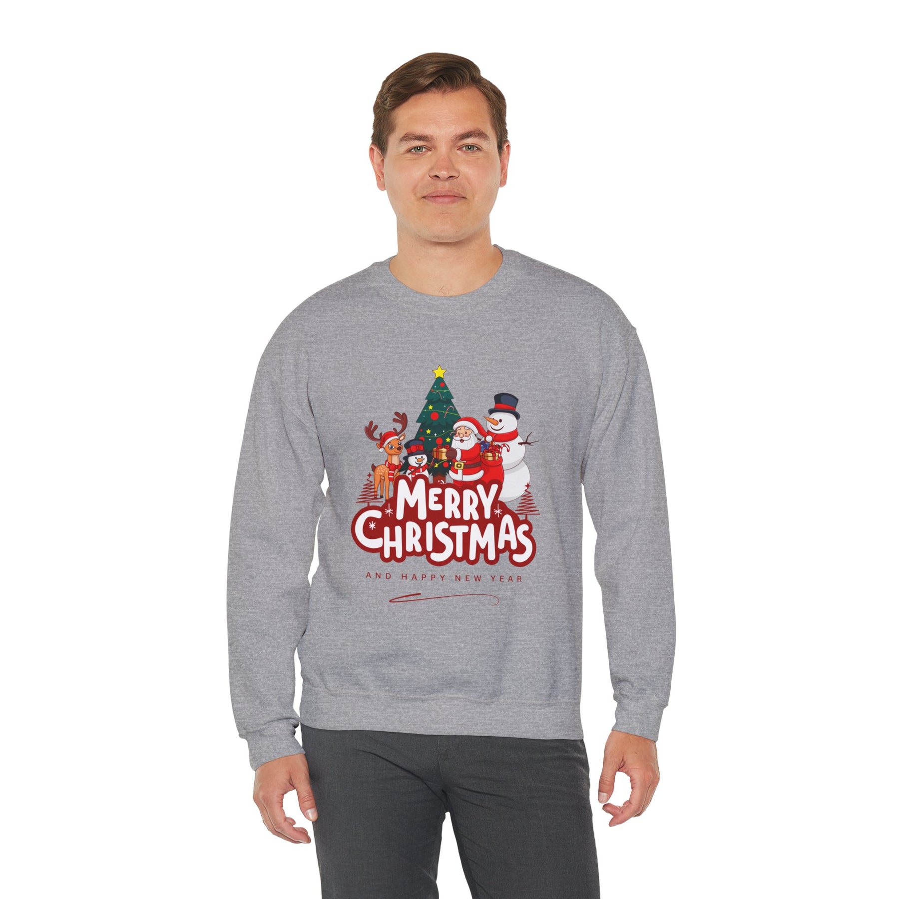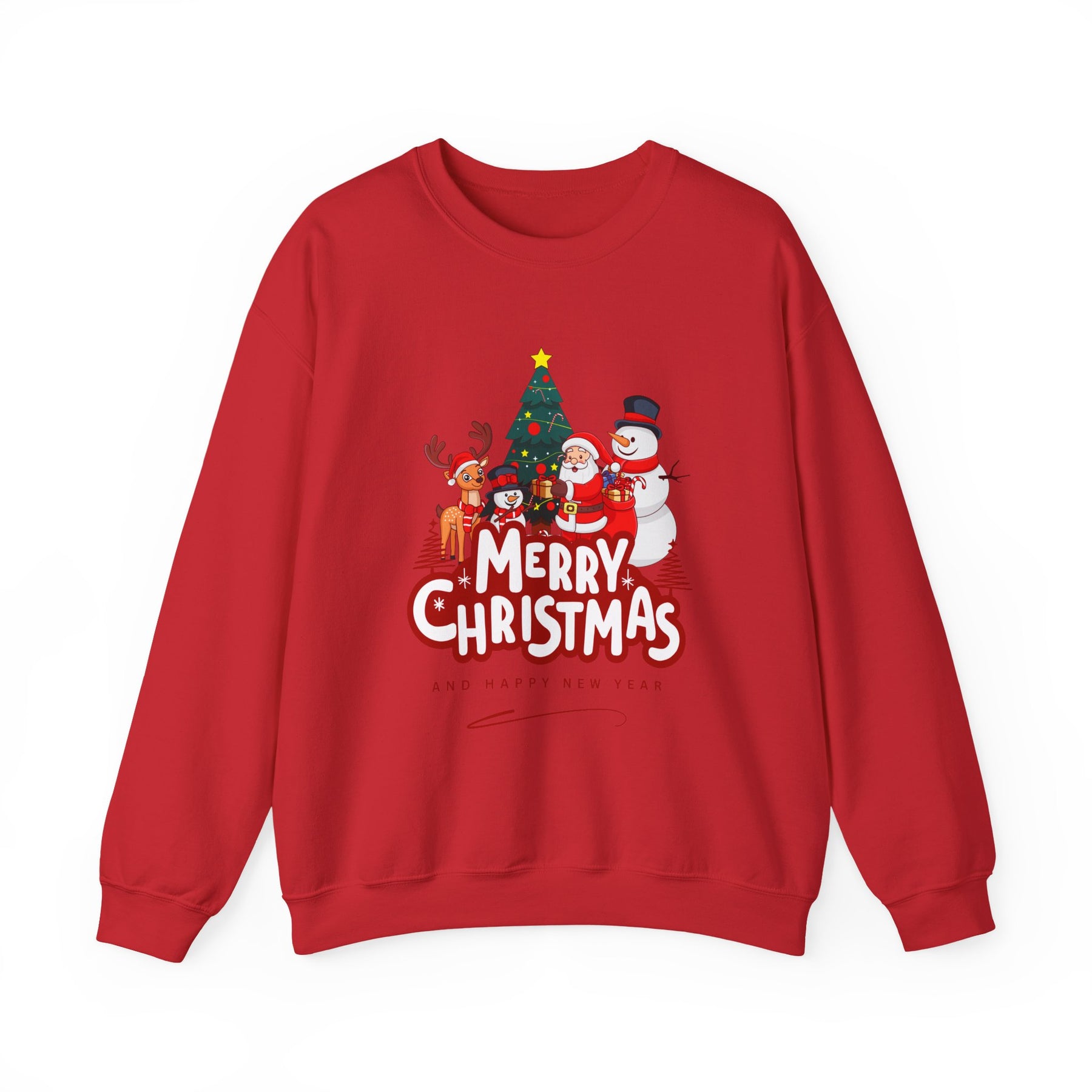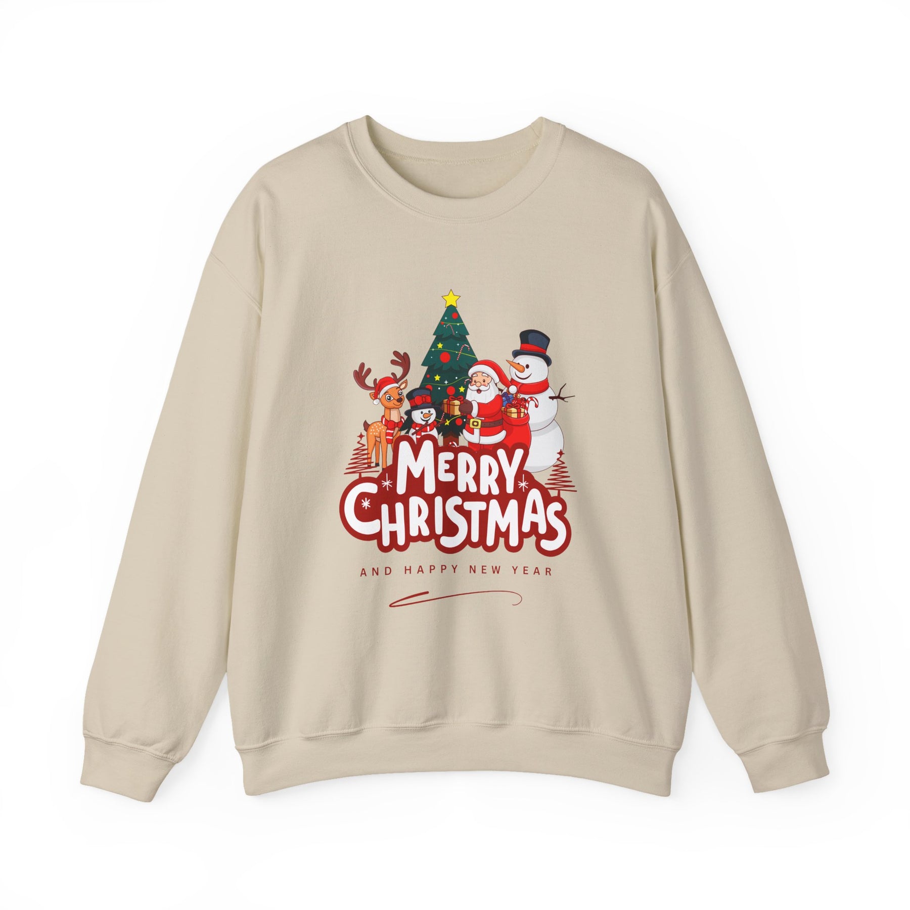 Soft, warm, and quietly festive — this crewneck sweatshirt brings cozy holiday cheer without shouting. A medium-heavy cotton-poly blend wraps you in gentle warmth while a playful Merry Christmas illustration sits centered on the chest: Santa, a snowman, reindeer and a decorated tree in joyful, nostalgic colors. The classic crew neckline and clean fit make it easy to layer over shirts or wear on its own during casual gatherings. Thoughtful details — like durable double-needle stitching, a tear-away label for itch-free comfort, and eco-conscious dyes — mean this sweatshirt feels as good as it looks. It’s the kind of sweater you pull on for slow mornings by the tree, neighborhood caroling, or low-key family movie nights under twinkle lights.