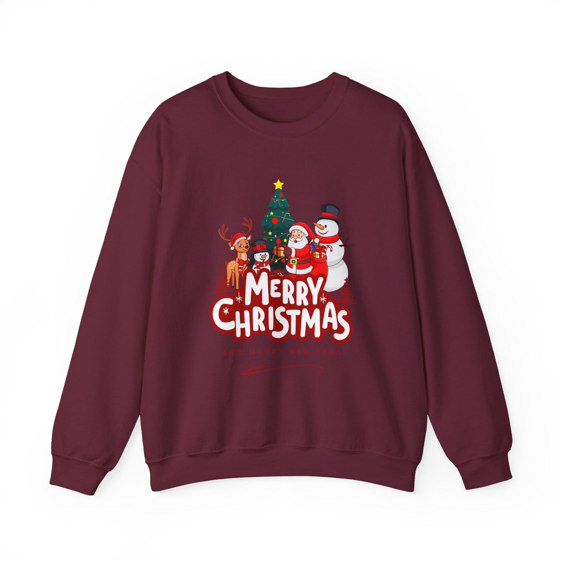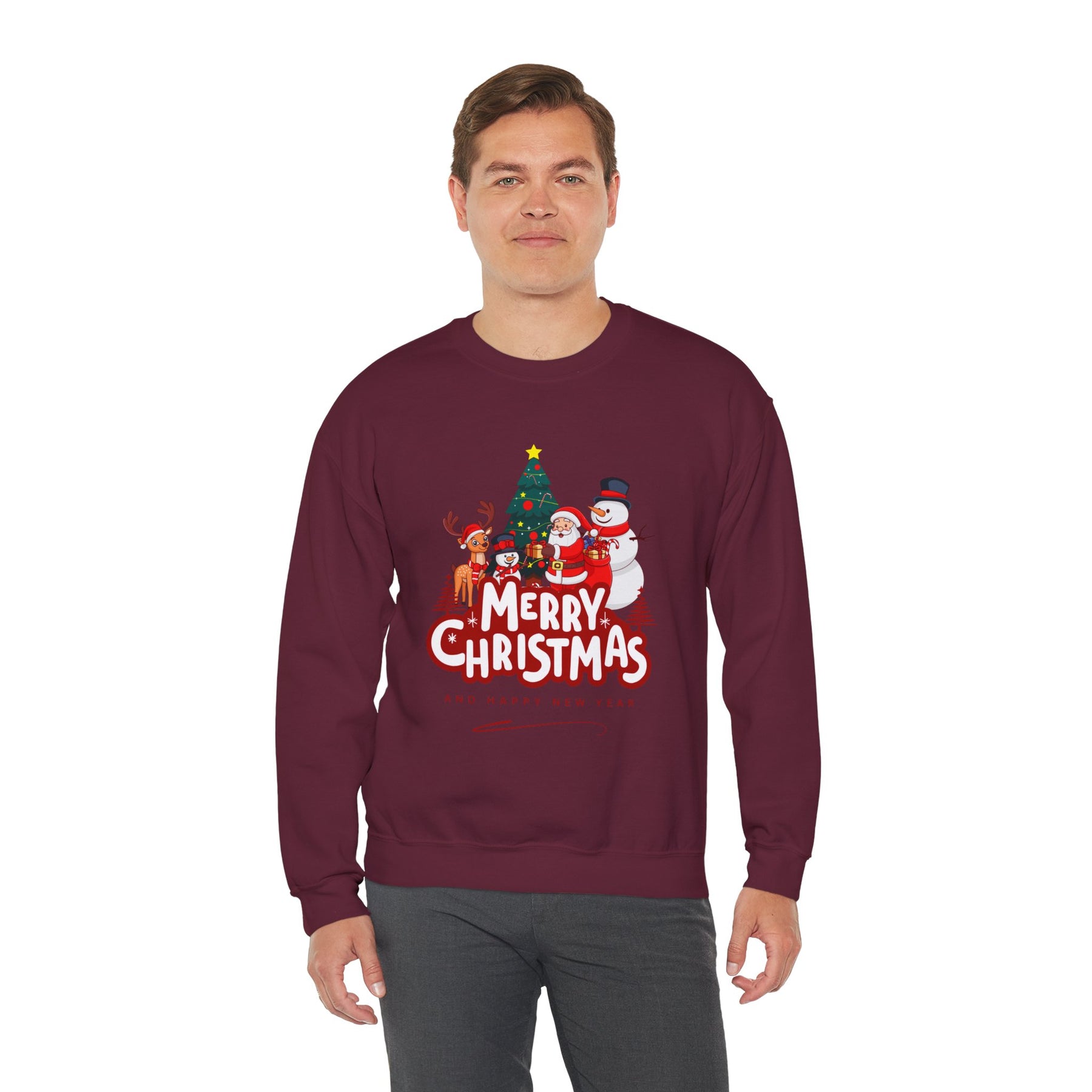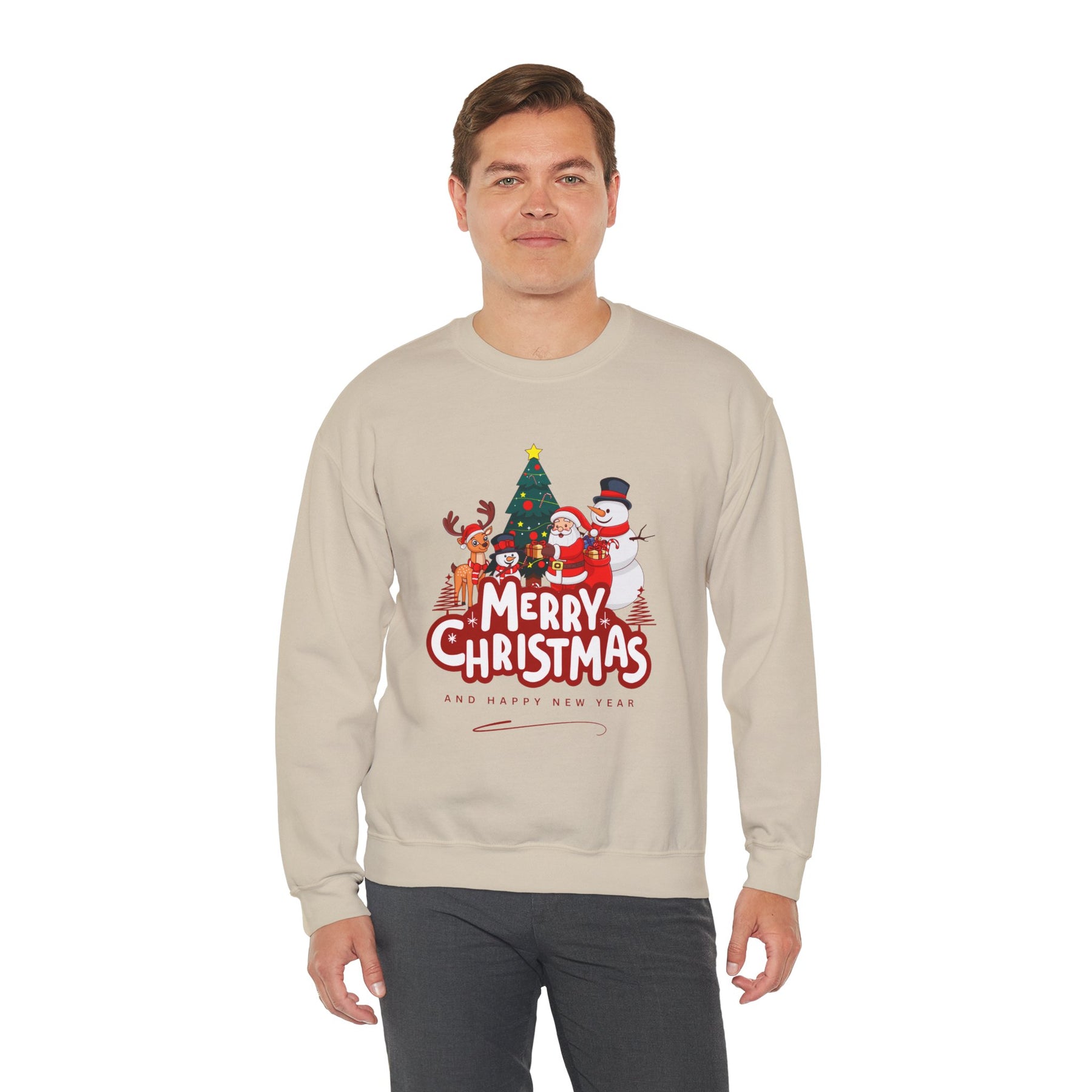 Soft, warm, and quietly festive — this crewneck sweatshirt brings cozy holiday cheer without shouting. A medium-heavy cotton-poly blend wraps you in gentle warmth while a playful Merry Christmas illustration sits centered on the chest: Santa, a snowman, reindeer and a decorated tree in joyful, nostalgic colors. The classic crew neckline and clean fit make it easy to layer over shirts or wear on its own during casual gatherings. Thoughtful details — like durable double-needle stitching, a tear-away label for itch-free comfort, and eco-conscious dyes — mean this sweatshirt feels as good as it looks. It’s the kind of sweater you pull on for slow mornings by the tree, neighborhood caroling, or low-key family movie nights under twinkle lights.
