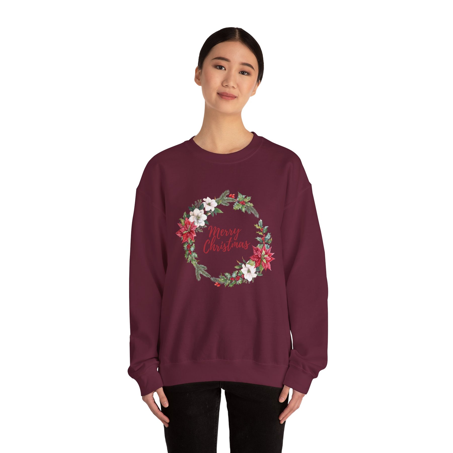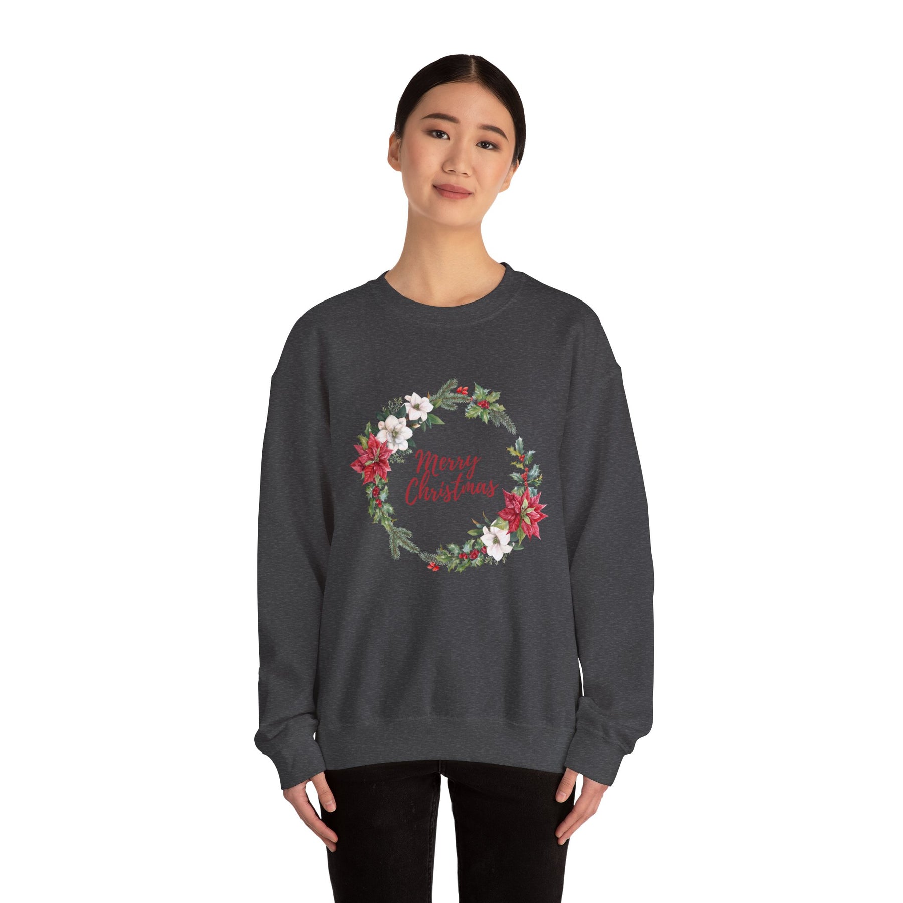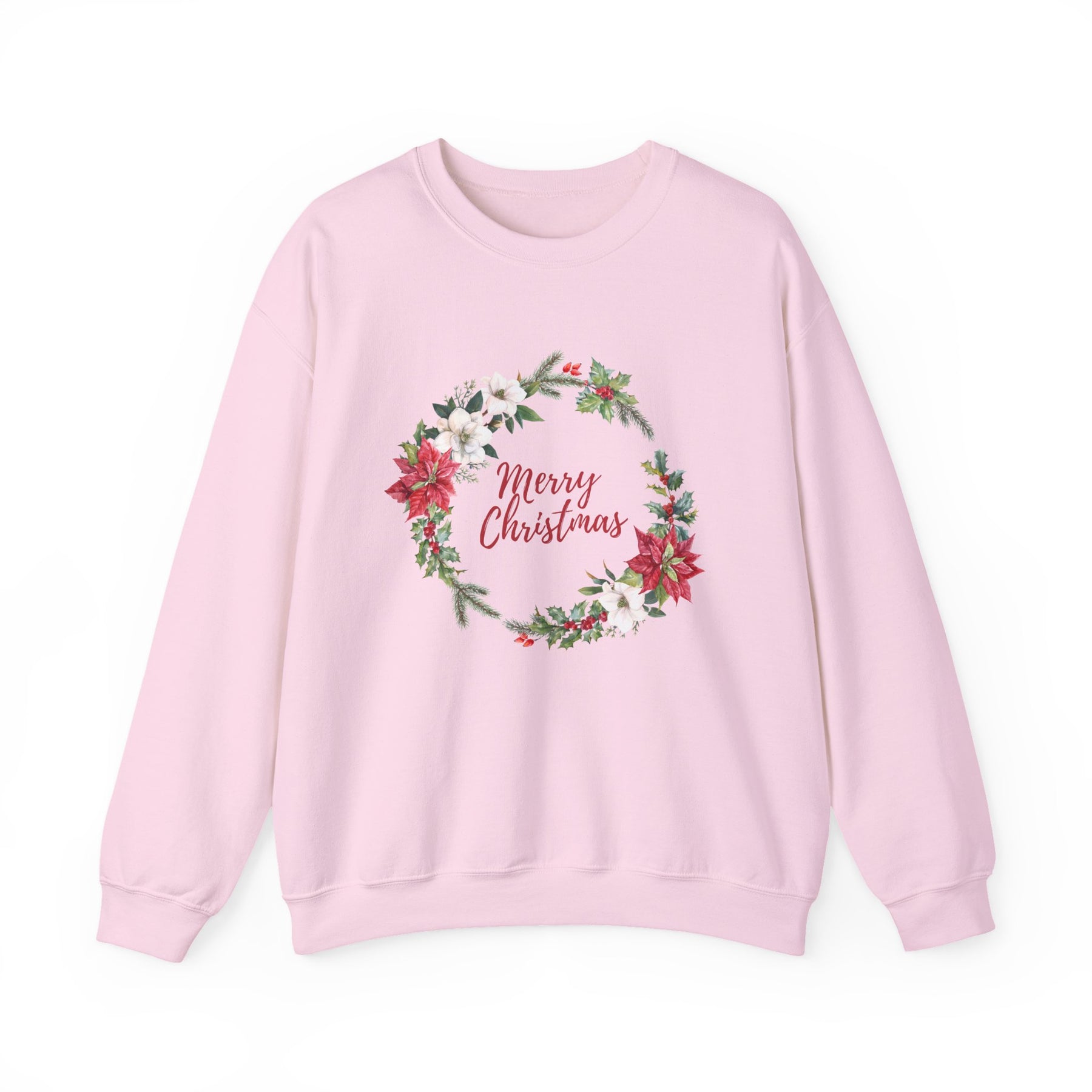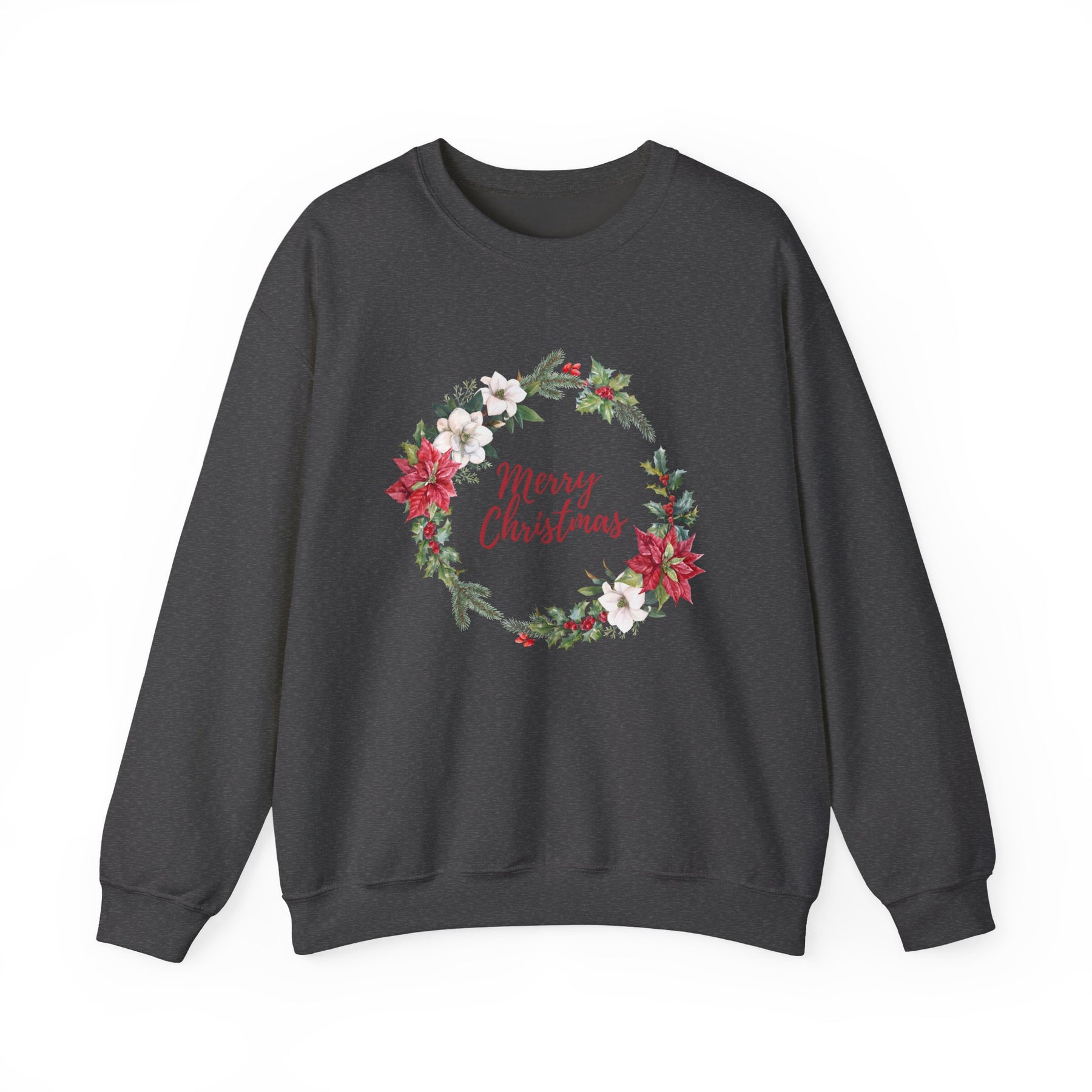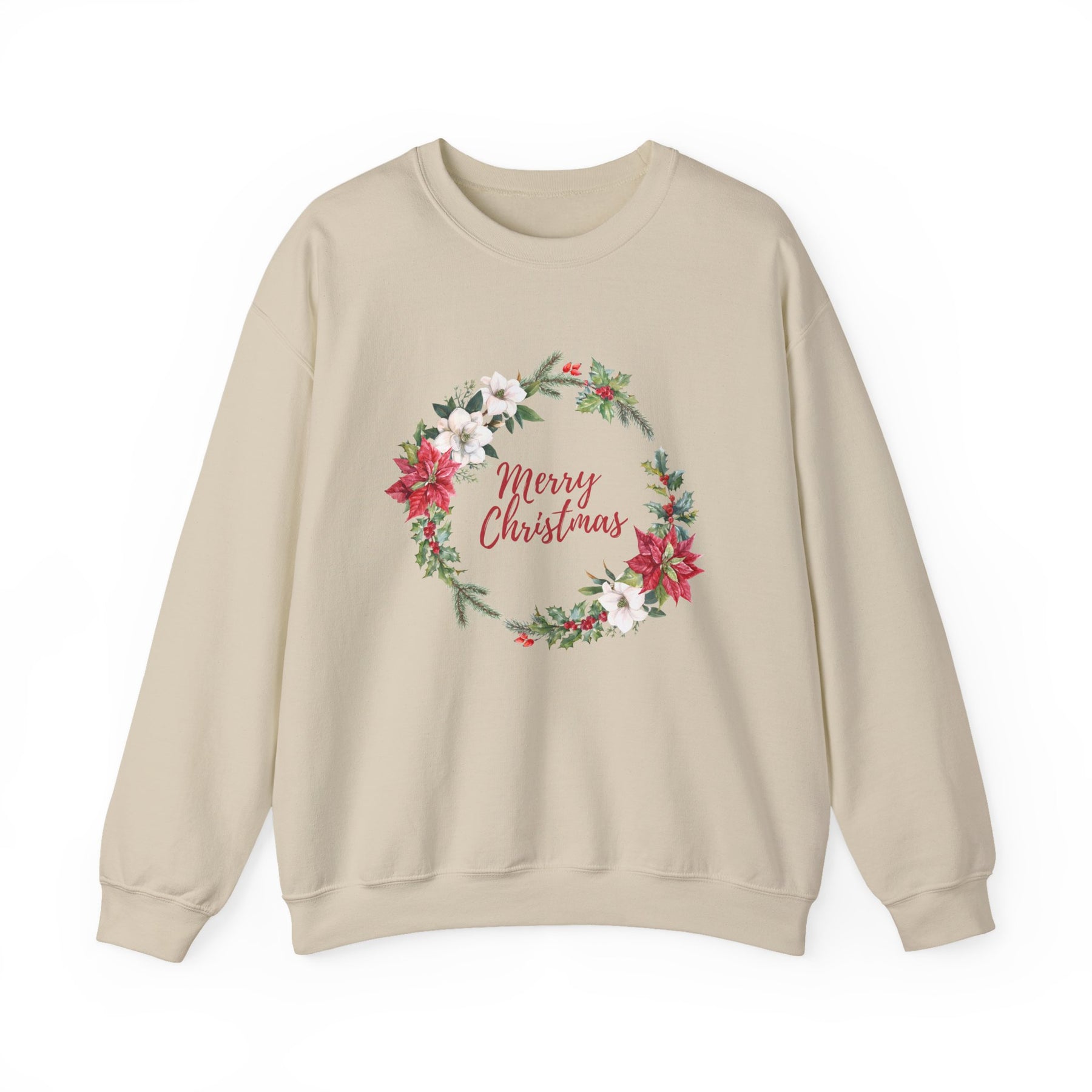 This cozy crewneck brings a quiet, handmade holiday to your everyday wardrobe. Soft, midweight fleece wraps you in warmth while a delicate wreath of poinsettias, evergreen sprigs, and berries frames a gentle “Merry Christmas” script. The design reads like a handwritten card hung over a mantel — comforting, familiar, and quietly festive. Wear it on slow mornings with coffee, at low-key family gatherings, or when you’re decorating the tree and want something that feels like the season without shouting for attention. It drapes easily with a clean neckline and durable stitching, so the wreath keeps looking fresh year after year.